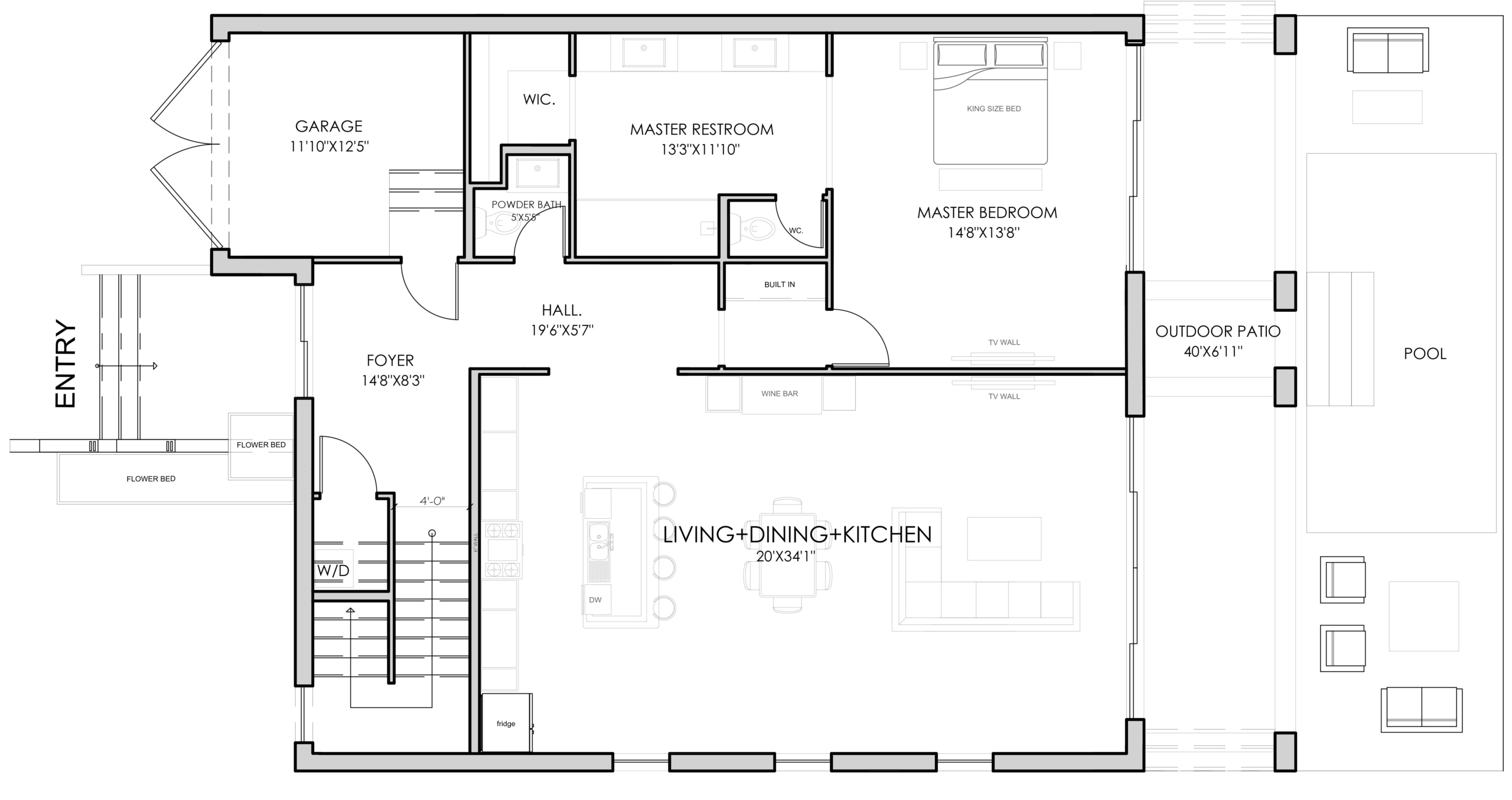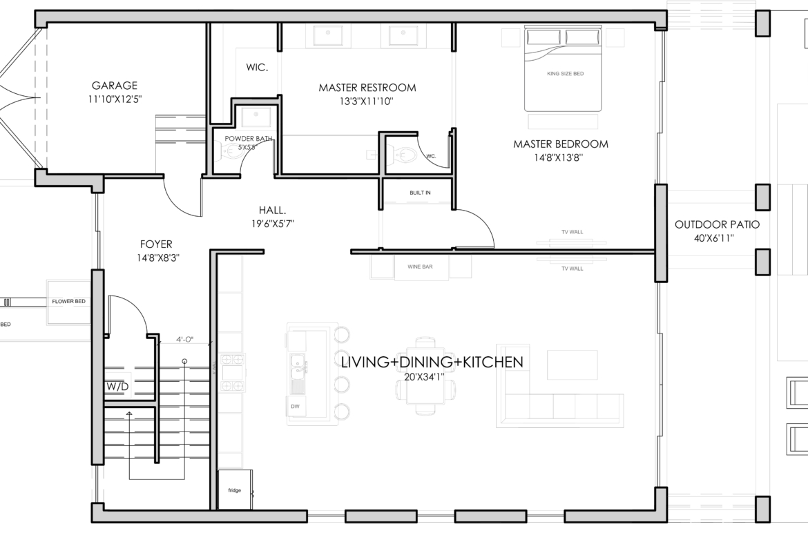 First floor with kitchen, living area, primary bedroom, primary bathroom and garage
